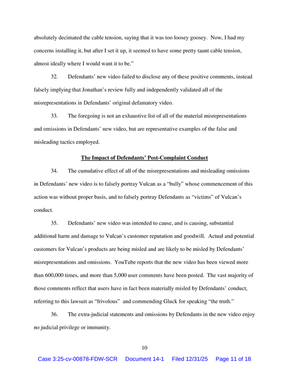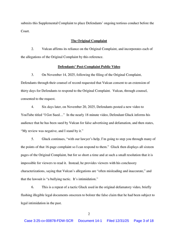Vulcan Strength has filed a Supplemental Complaint in its federal case against Gluck’s Gym LLC based on additional post-filing conduct, including a second public video that repeats and expands upon prior misrepresentations.